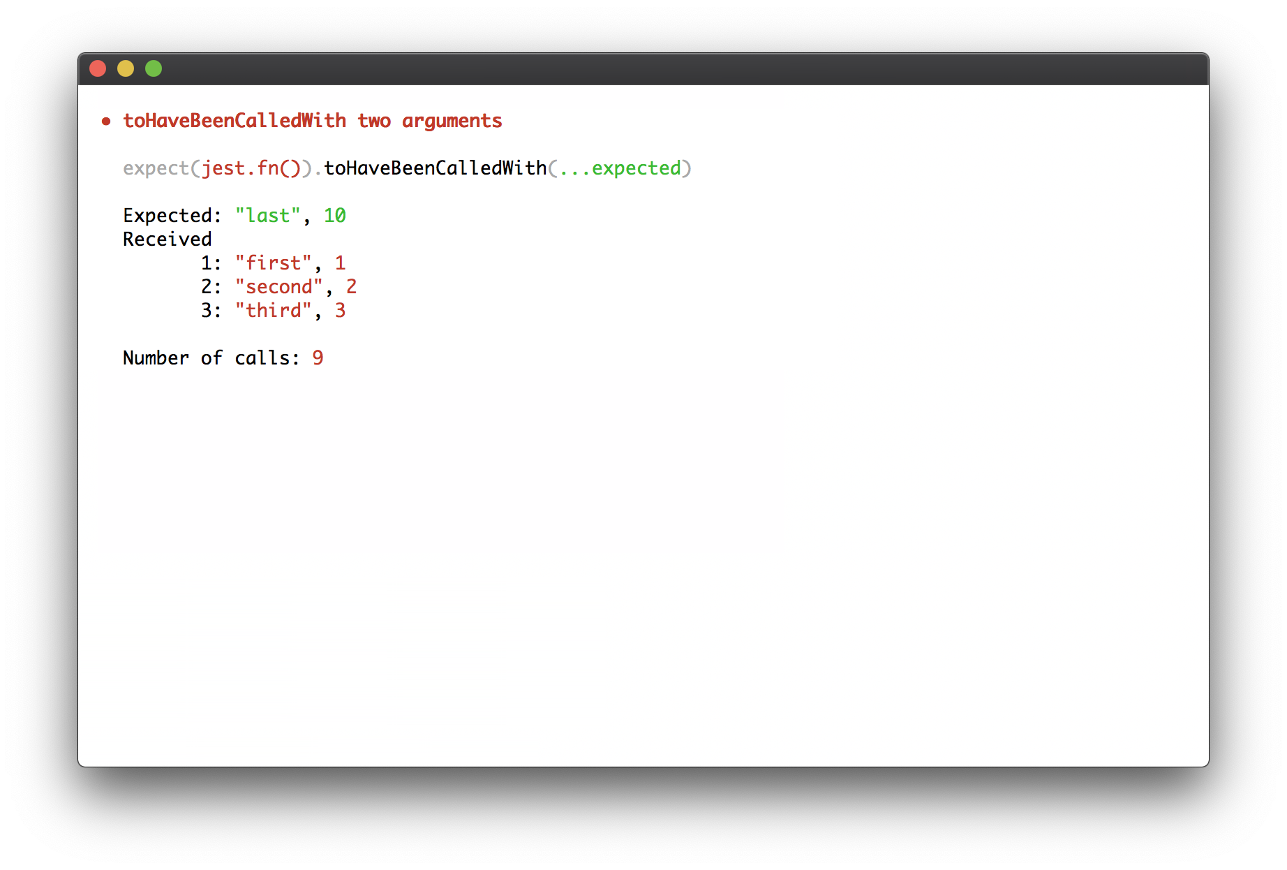 Tests fail—when they do, Jest provides rich context why. Here are some examples: